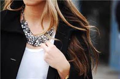 O maxi colar é vistoso, portanto pode ser o destaque de um look mais básico. Use com uma t-shirt branca (pode ser de malha “podrinha”) + blazer acinturado preto.