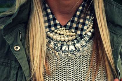 Para as mais ousadas, incremente seu tricô com um maxi colar feito de cristais pérolas e franjas de metal . Sobreponha com uma camisa xadrez vichy (xadrez miudinho) embaixo do tricô e cobrir o colar com a gola. Aliás, caso você queira uma produção mais discreta, use somente o tricô com o maxi colar.